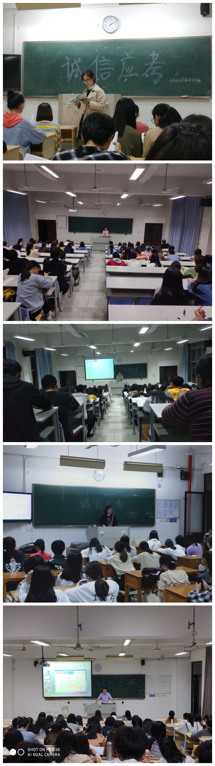 各班主持人帶領(lǐng)大家認(rèn)真學(xué)習(xí)了《考試管理工作辦法》、《違紀(jì)處分規(guī)定》等相關(guān)文件中關(guān)于誠(chéng)信考試的內(nèi)容,并通過(guò)講述真實(shí)的因?yàn)榭荚囎鞅锥惶幏值陌咐嬲]同學(xué)們誠(chéng)信對(duì)于一個(gè)人的學(xué)習(xí)、事業(yè)、交際的重要性,讓同學(xué)們清楚的認(rèn)識(shí)到了考試作弊的危害。告誡大家不要做缺失誠(chéng)信的事情,要做一個(gè)講誠(chéng)信的人。雖然這些不勞而獲的事情很有誘惑力,但一定要堅(jiān)定自己的信念,堅(jiān)決抵制誘惑,要自尊自信,做個(gè)誠(chéng)實(shí)守信的人。