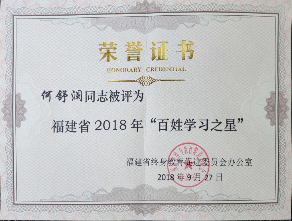 喜報-我系何舒瀾同志榮獲福建省2018年“百姓學習之星”稱號