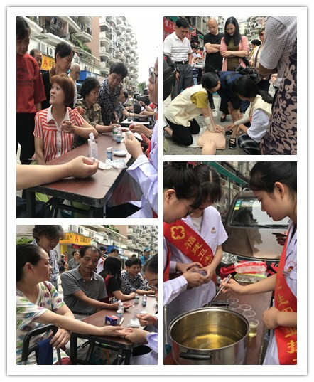 現(xiàn)場開展的活動主要有測血壓、量血糖、煮花茶、培訓(xùn)急救技能等幾個方面?;顒又锌梢钥吹街驹刚邆冋J真卻又略顯緊張的面容,同學(xué)們一邊負責(zé)任的為居民量血壓、測血糖,一邊還囑托那些血壓偏高的人注意飲食,避免食用可能造成血壓升高的食物。經(jīng)過兩個多小時的辛苦忙碌,活動接近尾聲,居民們也都帶著滿意的笑容離開,他們?nèi)宕蔚囟?,期待并歡迎同學(xué)們下次再來。