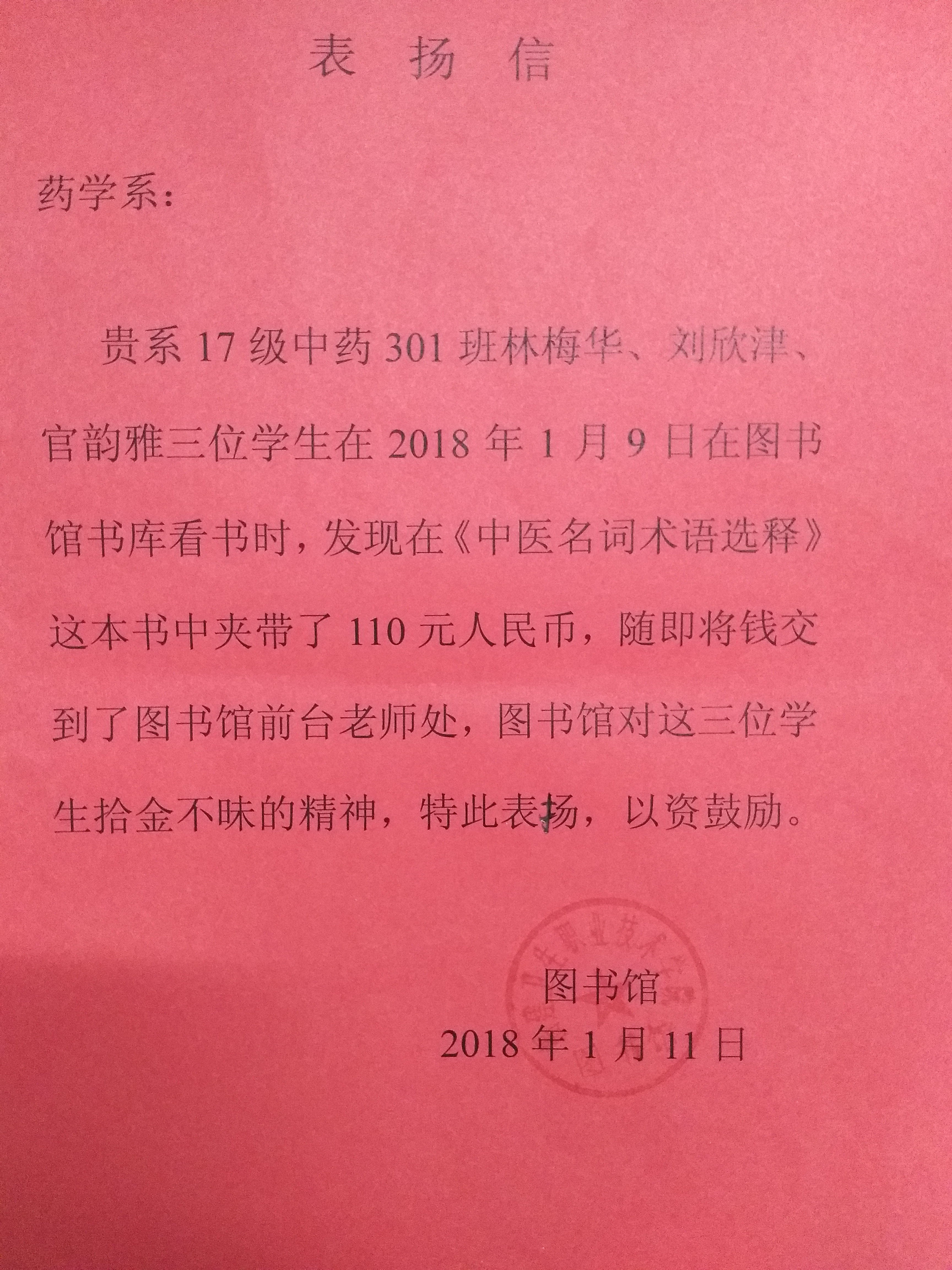 2018年1月11日,藥學(xué)系收到圖書(shū)館對(duì)我系17級(jí)中藥301班林梅華、劉欣津、官韻雅三位學(xué)生的表?yè)P(yáng)信。這三位學(xué)生在