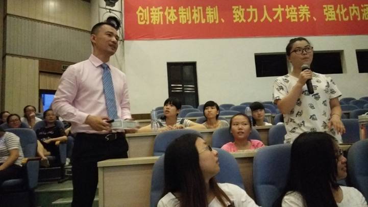 莊東華先生先對(duì)本次聚賢堂精英匯公益講座做整體介紹,再由鄭紅武老師對(duì)面試技巧進(jìn)行集體授課。他采用抽牌形式提高學(xué)生積極性,提高學(xué)生的參與性,在互動(dòng)游戲中讓同學(xué)們了解醫(yī)藥代表的定義、外企招收員工面試的流程。同時(shí)在現(xiàn)場(chǎng)找同學(xué)進(jìn)行模擬面試,并對(duì)其在模擬面試中的不足之處作了點(diǎn)評(píng)。最后他就面試中的具體細(xì)節(jié)進(jìn)行培訓(xùn)指導(dǎo),他指出在面試中要知己知彼,對(duì)自己的需求、性格要全方面了解,也要對(duì)面試崗位的職責(zé)了解清楚,在談吐、禮儀、回答問(wèn)題技巧等方面也給出了具體的方法和建議。
