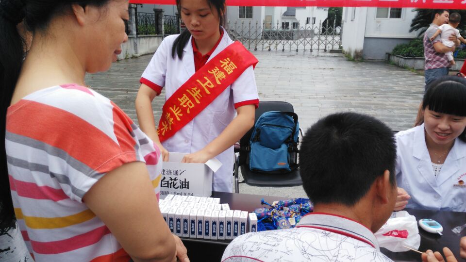 7月3日清晨,在當地團委工作人員的帶領下, 福建衛(wèi)生職業(yè)技術學院藥學系“炫藥青春”服務隊的志愿者們針對當地農民的義診活動在黃坑鎮(zhèn)鎮(zhèn)中心嘉禾廣場拉開了序幕。本次義診主要是為建陽市黃坑鎮(zhèn)的鄉(xiāng)民進行血壓測量、血糖常規(guī)檢查、發(fā)放中藥香囊、惠農小報、常見疾病預防小報,以及由黃氏藥業(yè)贊助的白花油等。