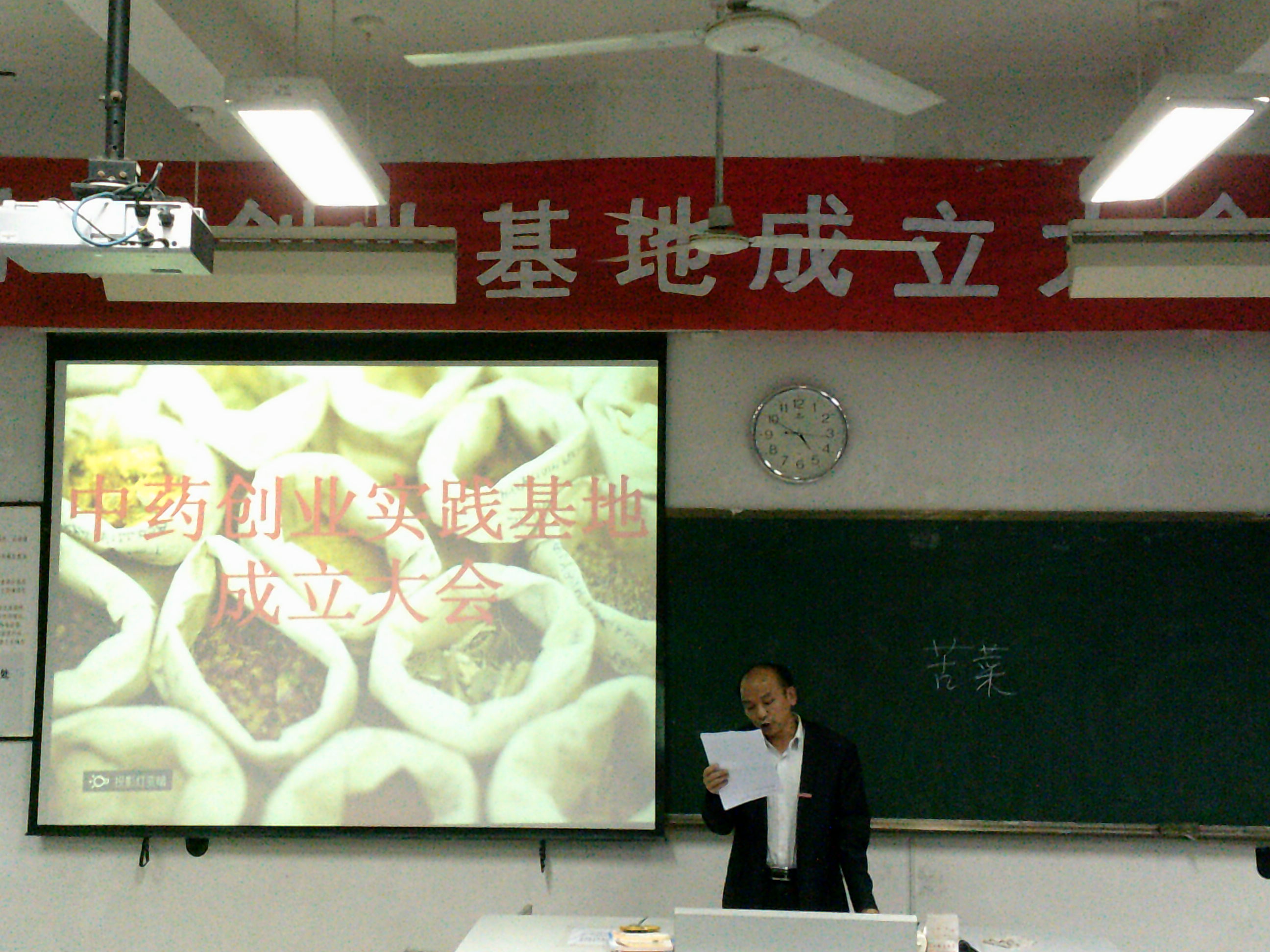 藥學(xué)系于2014年11月19日下午4:30在藥一階舉行中藥創(chuàng)業(yè)基地成立大會(huì)。系黨總支蘇愛華書記、 系黨總支林穎峰副書記、系第二黨支部書記何舒瀾老師、系第三黨支部書記陳瑜老師、系團(tuán)總支書記林麗鳳老師、系團(tuán)總支副書記李寶珠老師、中藥教研室林貴燦老師應(yīng)邀出席了本次大會(huì)。