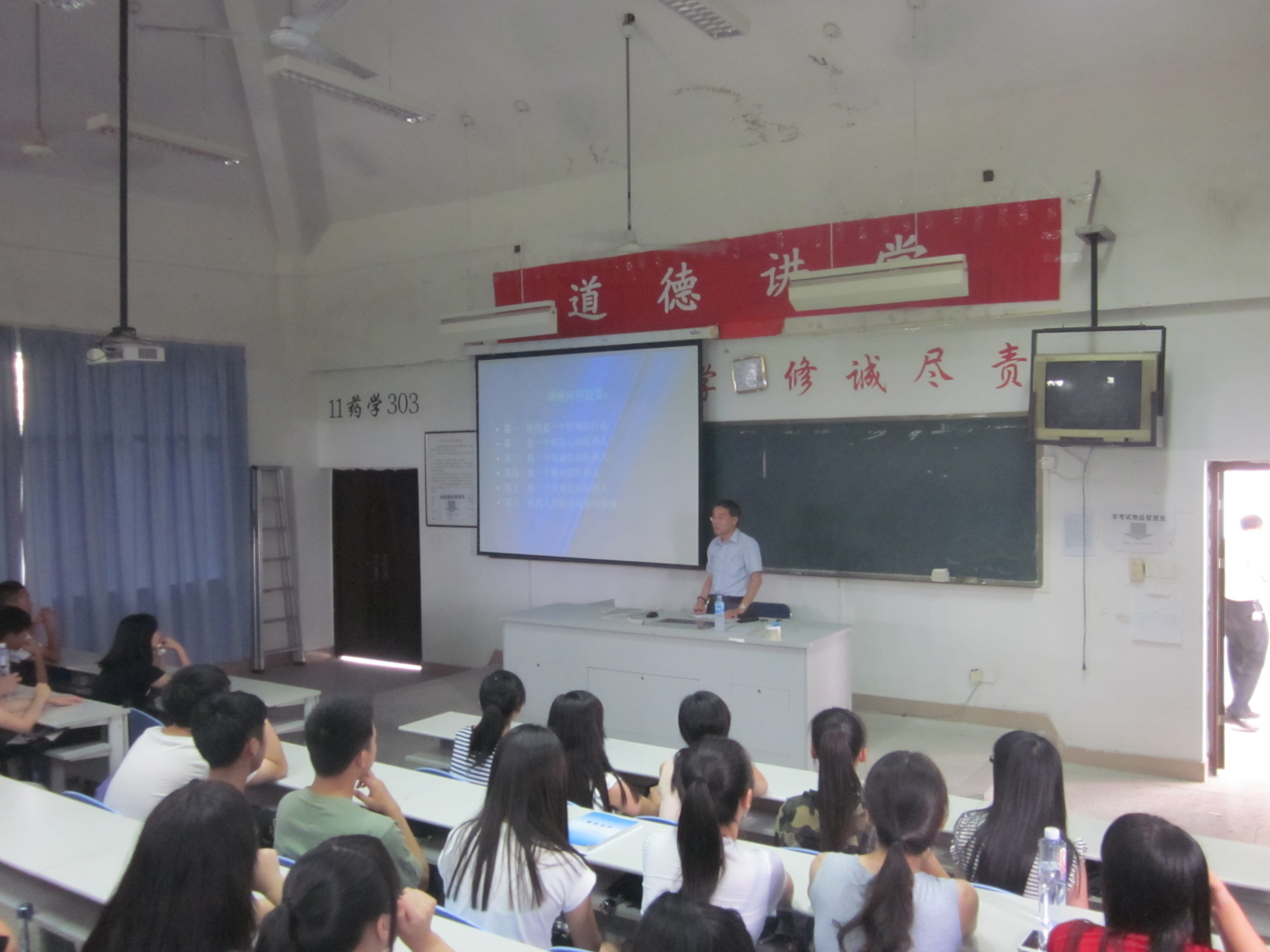 隨后由原藥學(xué)系黨總支書(shū)記歐春木副教授給同學(xué)帶來(lái)了《珍愛(ài)生命 創(chuàng)造健康--醫(yī)藥人員職業(yè)道德教育》的精彩講座。首先,介紹了醫(yī)藥行業(yè)是一個(gè)特殊行業(yè),醫(yī)藥產(chǎn)品關(guān)系著人類的生命健康,與人類生存息息相關(guān)。其次,通過(guò)大量的案例分析介紹,如何做一個(gè)有良心、有誠(chéng)信、守規(guī)范和敬業(yè)的醫(yī)藥人員。最后,從調(diào)整健康的心態(tài)、養(yǎng)成良好的習(xí)慣、進(jìn)行有效的溝通和確定明確的目標(biāo)等四方面教導(dǎo)學(xué)生培養(yǎng)良好的職業(yè)道德。
