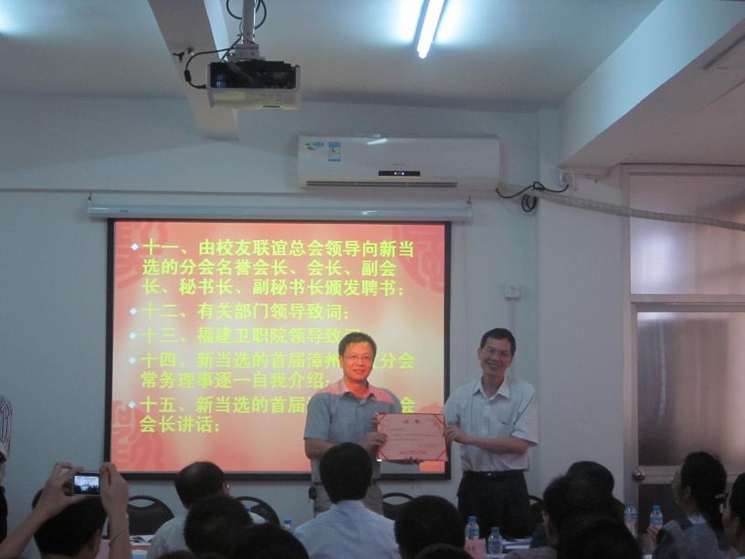 會(huì)上,漳州市醫(yī)院藥學(xué)部李碧峰主任作為籌備組代表向與會(huì)人員報(bào)告漳州校友分會(huì)籌備情況;與會(huì)代表審議并表決通過漳州校友分會(huì)章程,選舉產(chǎn)生了首屆漳州校友分會(huì)理事、常務(wù)理事,首屆漳州校友分會(huì)會(huì)長、副會(huì)長、秘書長及副秘書長,并由我院廖偉堅(jiān)副院長向新當(dāng)選的漳州校友分會(huì)領(lǐng)導(dǎo)頒發(fā)聘書。