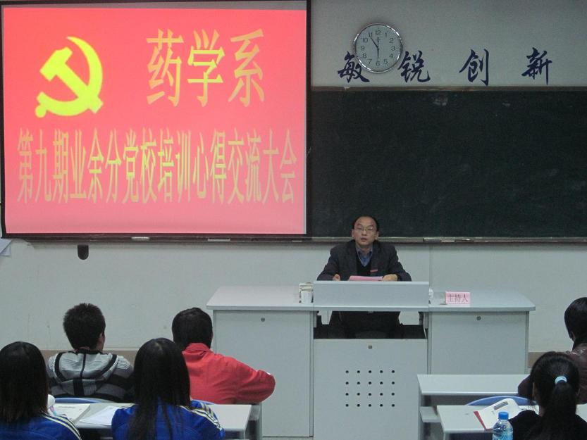我系第九期業(yè)余分黨校培訓(xùn)心得交流會于12月15日下午在藥學(xué)系第一階梯教室舉行,系黨總支蘇愛華副書記,系團總支書記王鈍銳老師,系團總支副書記陳炳秀老師出席了本次交流會。