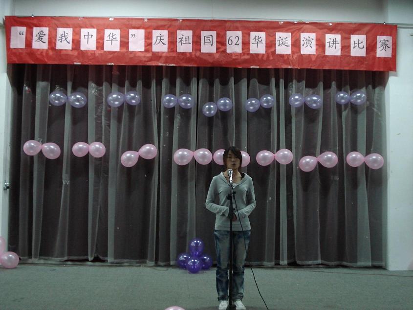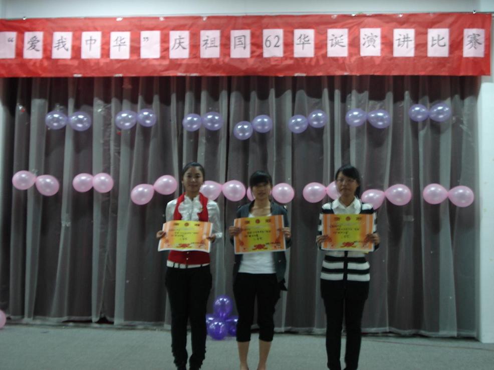 為慶祝中華人民共和國成立62周年華誕,豐富校園文化生活,我系于10月19日在明湖三樓舉行“歌頌祖國”主題演講比賽。系黨總支蘇愛華副書記蒞臨現(xiàn)場觀看比賽,系團總支書記王鈍銳老師、系團總支副書記陳炳秀老師、陳瑜老師、院廣播站站長許晨、系學生會主席鄭彬焮、團組織委員張麗萍擔任此次演講比賽的評委。