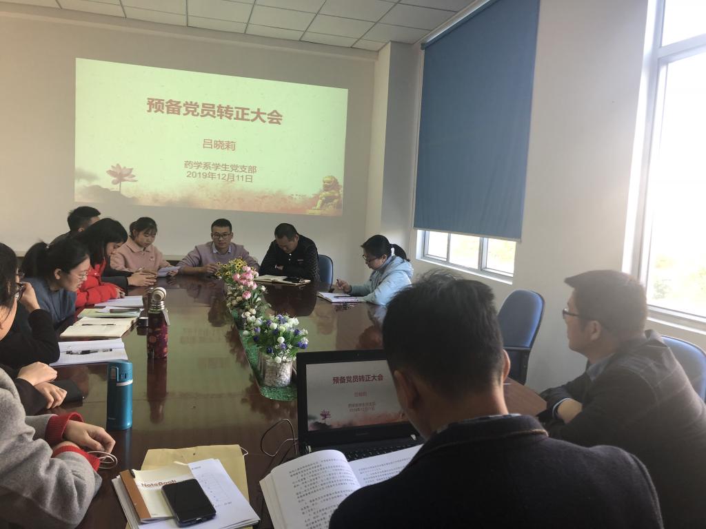 2019年12月9日下午,藥學系學生黨支部于系部會議室召開預備黨員轉正大會,討論關于呂曉莉同志轉正事宜。大會由藥學系學生黨支部陳翰書記主持,支部全體黨員出席大會。