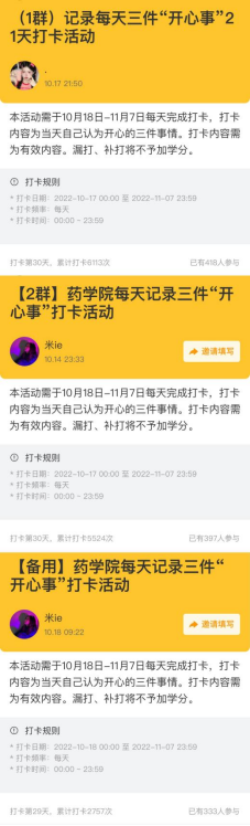 本次,藥學院以每天記錄三件“開心事”21天打卡活動為主推,組織同學們線上打卡“開心事”,引導同學們學會多發(fā)現生活中美好的人和事,以積極向上的心態(tài)面對生活,此次活動吸引力千余名學生參與,累計打卡人次超1.4萬。