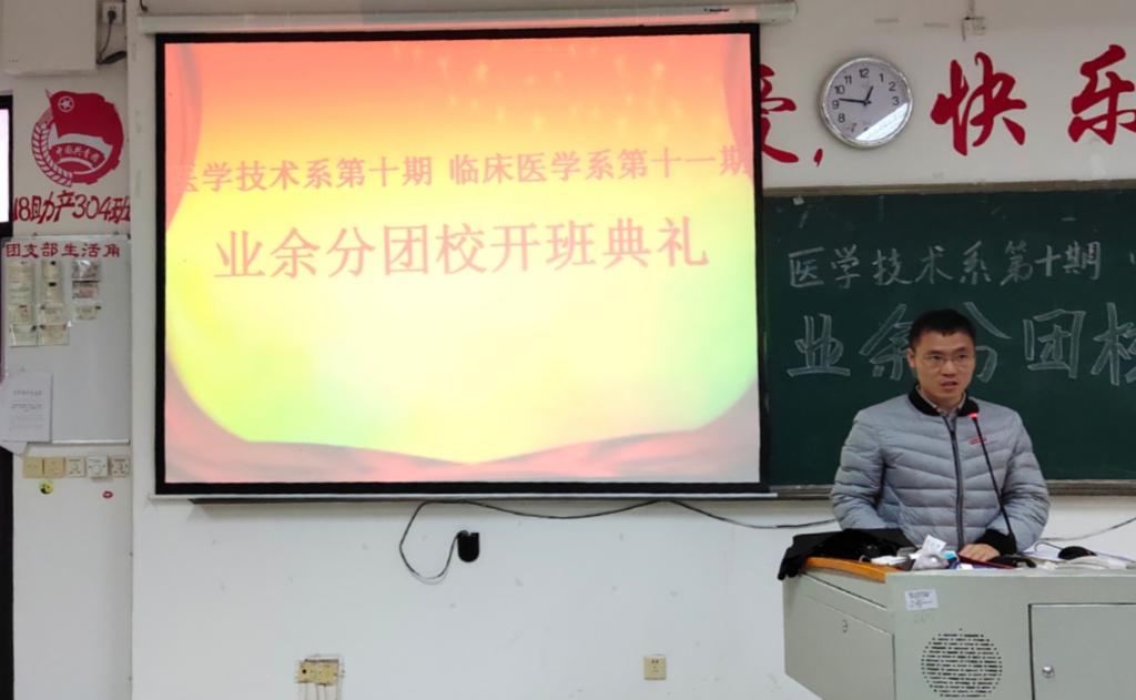 為提高團(tuán)組織的凝聚力和戰(zhàn)斗力,做好我系學(xué)生團(tuán)員的發(fā)展工作。臨床醫(yī)學(xué)系第十一期業(yè)余分團(tuán)校于12月20日中午在教學(xué)樓210舉行開班儀式。我系黨總支負(fù)責(zé)人陳俊穎副書記、陳潔副書記、醫(yī)學(xué)技術(shù)系黨總支負(fù)責(zé)人邱滾忠副書記、兩系團(tuán)總支書記、副書記和輔導(dǎo)員老師們,以及兩系各委員及業(yè)余分團(tuán)校的所有學(xué)員共同出席、參加了開班儀式。