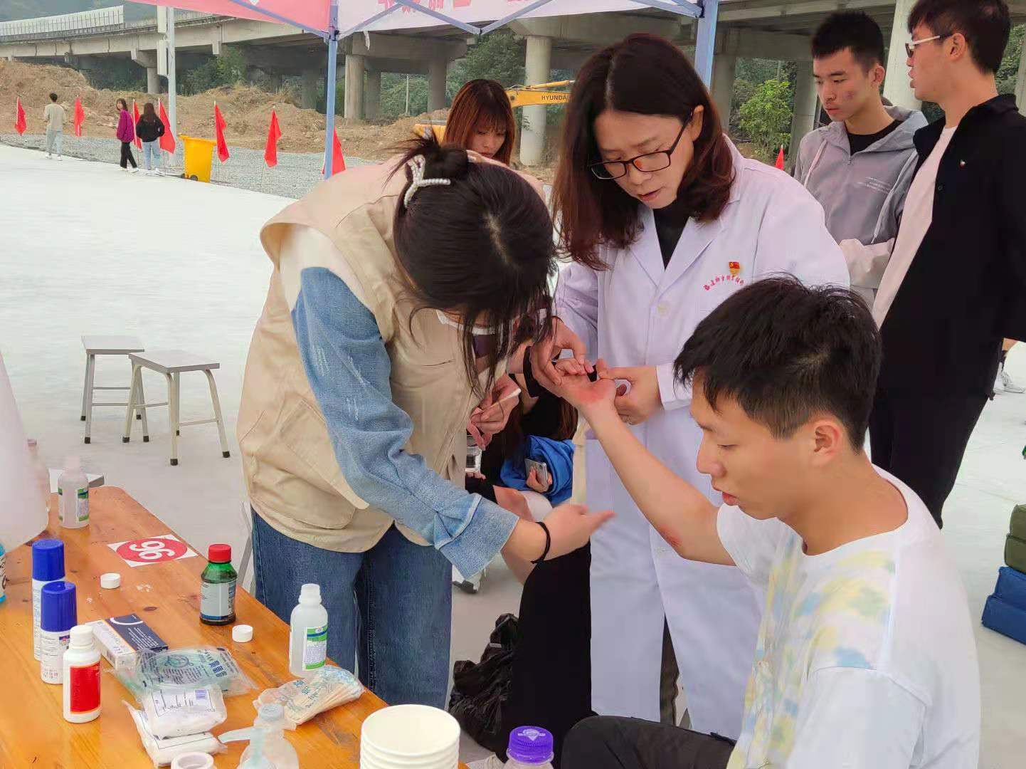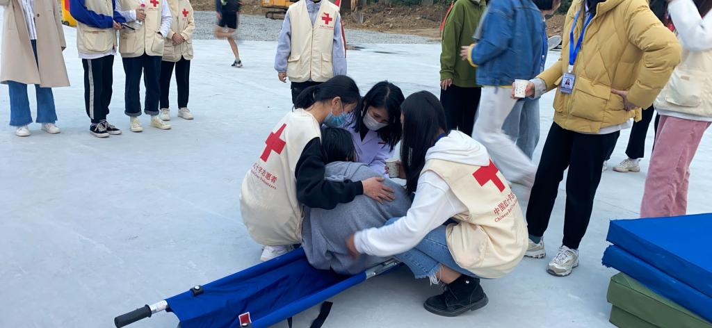 比賽開始前,醫(yī)療隊黨員教師及紅十字志愿者指導運動員進行賽前放松運動;賽中出現(xiàn)傷員時,及時為他們清洗、包扎傷口,并提醒注意事項。比賽期間,準備好裝有繃帶、紗布、碘伏、50%葡萄糖等數(shù)種藥物的紅十字急救箱守護在賽場旁。運動會為期3天,醫(yī)療隊全程陪伴在運動員身邊,為賽事安全保駕護航。
