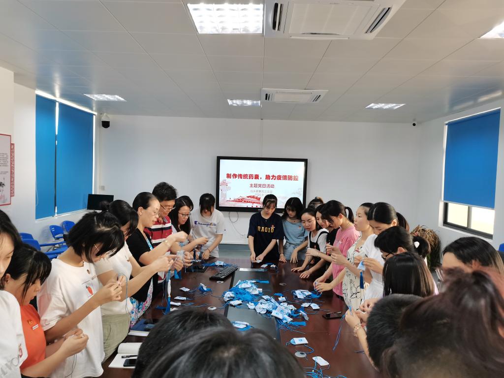 活動(dòng)中,支部全體師生分工合作,有條不紊,制作了數(shù)百個(gè)具有“芳香辟穢、祛邪解毒”防疫效用藥囊,會(huì)議室彌漫著清新怡人的中藥香。