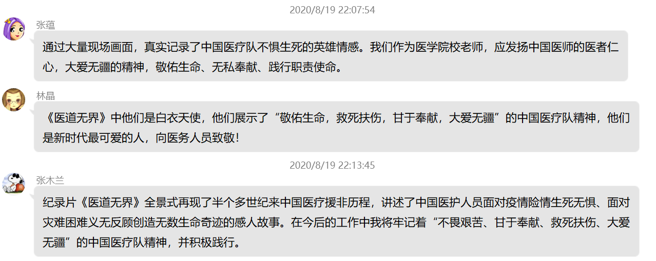 觀看之后,黨員紛紛發(fā)表感言,《醫(yī)道無界》體現(xiàn)了中國援外醫(yī)護人員不畏艱難、甘于奉獻、救死扶傷、大愛無疆的精神。我們作為醫(yī)學(xué)院校黨員教師,更應(yīng)在今后的工作中努力踐行和弘揚這種大無畏的奉獻精神。在這個具有特別意義的醫(yī)師節(jié),中國醫(yī)師群體依然沖鋒在國內(nèi)國際抗疫一線,醫(yī)道無界、大愛無疆,向白衣天使們致敬,向逆行者們致敬。