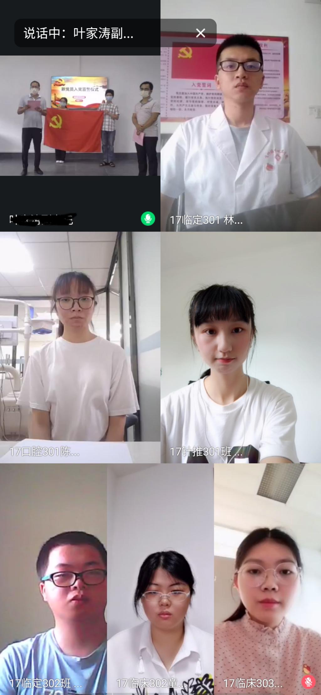 2020年7月1日,時(shí)值黨的第99個(gè)生日之際,臨床醫(yī)學(xué)系黨總支于實(shí)訓(xùn)樓310舉行新黨員入黨宣誓儀式。由于疫情緣故,6位17級新黨員未能到場而在線上參加,臨床醫(yī)學(xué)系黨總支副書記郭禮堅(jiān)、宣傳委員林浩、組織員葉家濤、第一黨支部書記朱翔、第二黨支部書記高長花及新黨員的入黨介紹人參加此次特殊的宣誓儀式。