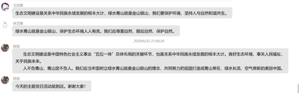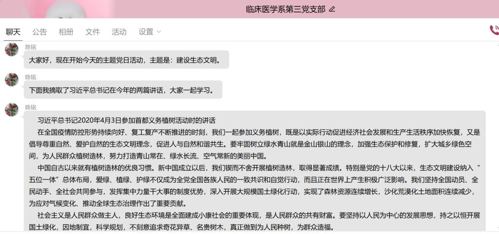 為認(rèn)真學(xué)習(xí)領(lǐng)會(huì)習(xí)近平生態(tài)文明思想,深刻把握綠水青山就是金山銀山的重要發(fā)展理念,6月22日晚上,臨床醫(yī)學(xué)系第三黨支部于線上開展“建設(shè)生態(tài)文明”主題黨日活動(dòng),此次活動(dòng)由支部書記陳銘同志主持。