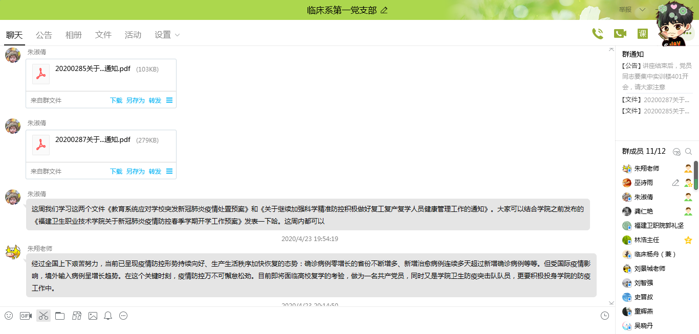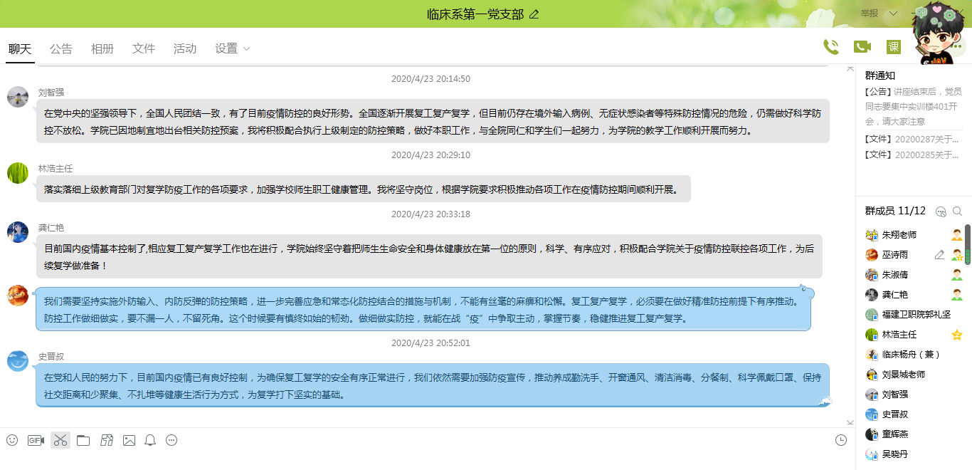 4月23日,臨床醫(yī)學系第一黨支部組織在線學習《教育系統(tǒng)應對學校突發(fā)新冠肺炎疫情處置預案》和《關(guān)于繼續(xù)加強科學精準防控積極做好復工復產(chǎn)復學人員健康管理工作的通知》,并且結(jié)合學院之前發(fā)布的《福建衛(wèi)生職業(yè)技術(shù)學院關(guān)于新冠肺炎疫情防控春季學期開學工作預案》紛紛發(fā)表了自己的學習體會。