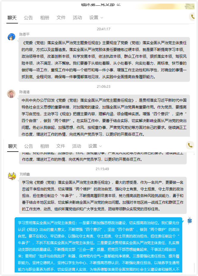 通過(guò)認(rèn)真自學(xué)并研讀文件,黨員同志們針對(duì)學(xué)習(xí)紛紛發(fā)表心得體會(huì),在線上展開討論。