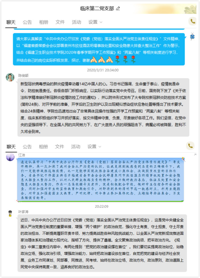 近日,臨床醫(yī)學(xué)系第二黨支部組織全體黨員在線學(xué)習(xí)中共中央辦公廳印發(fā)《黨委(黨組)落實(shí)全面從嚴(yán)治黨主體責(zé)任規(guī)定》、于偉國(guó)主持召開福建省委常委會(huì)會(huì)議部署泉州市欣佳酒店坍塌事故處置和安全隱患大排查大整治工作,以及《福建衛(wèi)生職業(yè)技術(shù)學(xué)院2020年春季學(xué)期開學(xué)工作預(yù)案》和“兩案八制”等相關(guān)制度。