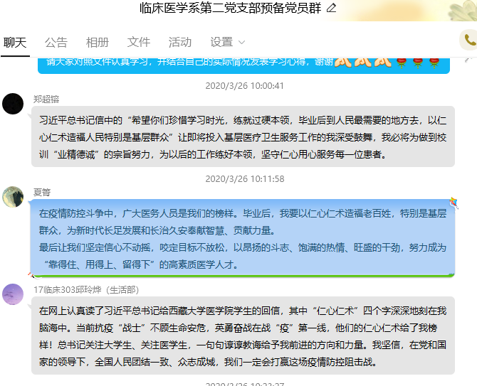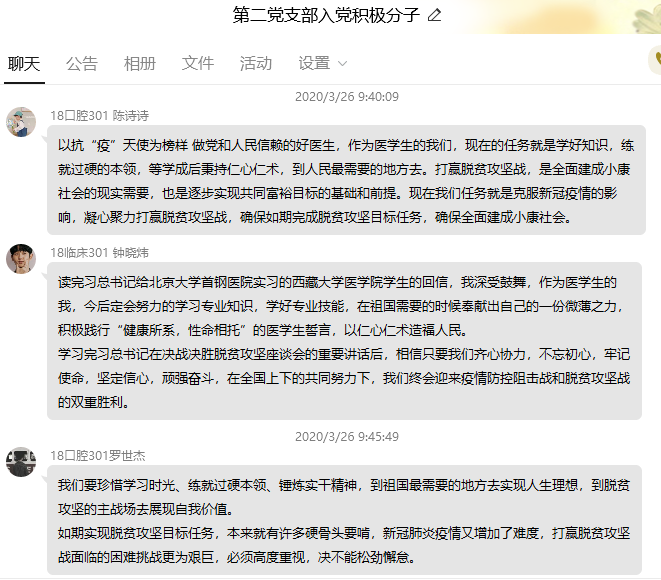 會上,全體黨員、入黨積極分子對照文件認(rèn)真學(xué)習(xí),充分交流。葉家濤同志表示:習(xí)近平總書記指出,今年是脫貧攻堅(jiān)戰(zhàn)最后一年,收官之年又遭遇疫情影響,各項(xiàng)工作任務(wù)更重、要求更高。習(xí)近平總書記的重要講話為我們決戰(zhàn)決勝脫貧攻堅(jiān)指明了方向,脫貧攻堅(jiān)戰(zhàn)不是輕輕松松,一沖鋒就能打贏的,必須高度重視面臨的困難挑戰(zhàn),堅(jiān)持不懈做好各項(xiàng)工作。陳恩平同志表示:作為一名輔導(dǎo)員,特別是醫(yī)學(xué)生的輔導(dǎo)員責(zé)任重大,我們在開展學(xué)生日常工作的同時(shí),要更多的對他們進(jìn)行愛國主義,職業(yè)道德教育,要將習(xí)近平總書記回信的精神融入學(xué)生的日常思想教育,讓學(xué)生時(shí)刻牢記習(xí)近平總書記對廣大青年學(xué)生的殷切期待,幫助引導(dǎo)學(xué)生努力學(xué)習(xí)專業(yè)知識,練就過硬本領(lǐng),錘煉品德修為,積極投身祖國和人民需要的地方,不忘醫(yī)者仁心初心,牢記救死扶傷的使命,用實(shí)際行動為醫(yī)療事業(yè)添磚加瓦。預(yù)備黨員譚勇強(qiáng)同志表示:在習(xí)近平總書記給首鋼醫(yī)院實(shí)習(xí)的西藏醫(yī)學(xué)生回信中提到:醫(yī)生是人民健康的守護(hù)者,這充分說明了醫(yī)生是崇高的,身為醫(yī)學(xué)生的我們,不僅要有扎實(shí)的專業(yè)知識,也要堅(jiān)定自身對醫(yī)學(xué)事業(yè)獻(xiàn)身的崇高信念,以仁心仁術(shù),為基層群眾奉獻(xiàn)出自己的力量,要以在新冠肺炎疫情中奮戰(zhàn)的同胞們?yōu)榘駱樱瑺幦∽鳇h和人民信賴的好醫(yī)生!入黨積極分子陳思琳同學(xué)表示:作為醫(yī)學(xué)生,我們應(yīng)當(dāng)培養(yǎng)自己嚴(yán)謹(jǐn)?shù)墓ぷ髯黠L(fēng)、精湛的醫(yī)療技術(shù)、無私的奉獻(xiàn)精神。正所謂健康所系,性命所托,這次的疫情,學(xué)長學(xué)姐們主動請纓,不為艱難奮戰(zhàn)在一線,更是給我們展現(xiàn)了作為醫(yī)學(xué)生今后應(yīng)該擔(dān)起的責(zé)任擔(dān)當(dāng)。