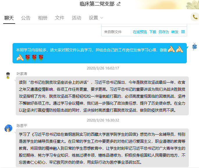 3月26日上午,臨床醫(yī)學(xué)系第二黨支部全體黨員、入黨積極分子開展了線上專題學(xué)習(xí),學(xué)習(xí)活動由支部書記高長花同志主持。此次專題學(xué)習(xí)主要圍繞《習(xí)近平總書記在決戰(zhàn)決勝脫貧攻堅(jiān)座談會上的講話》、《習(xí)近平總書記給首鋼醫(yī)院實(shí)習(xí)的西藏大學(xué)醫(yī)學(xué)院學(xué)生的回信》等六份材料展開。