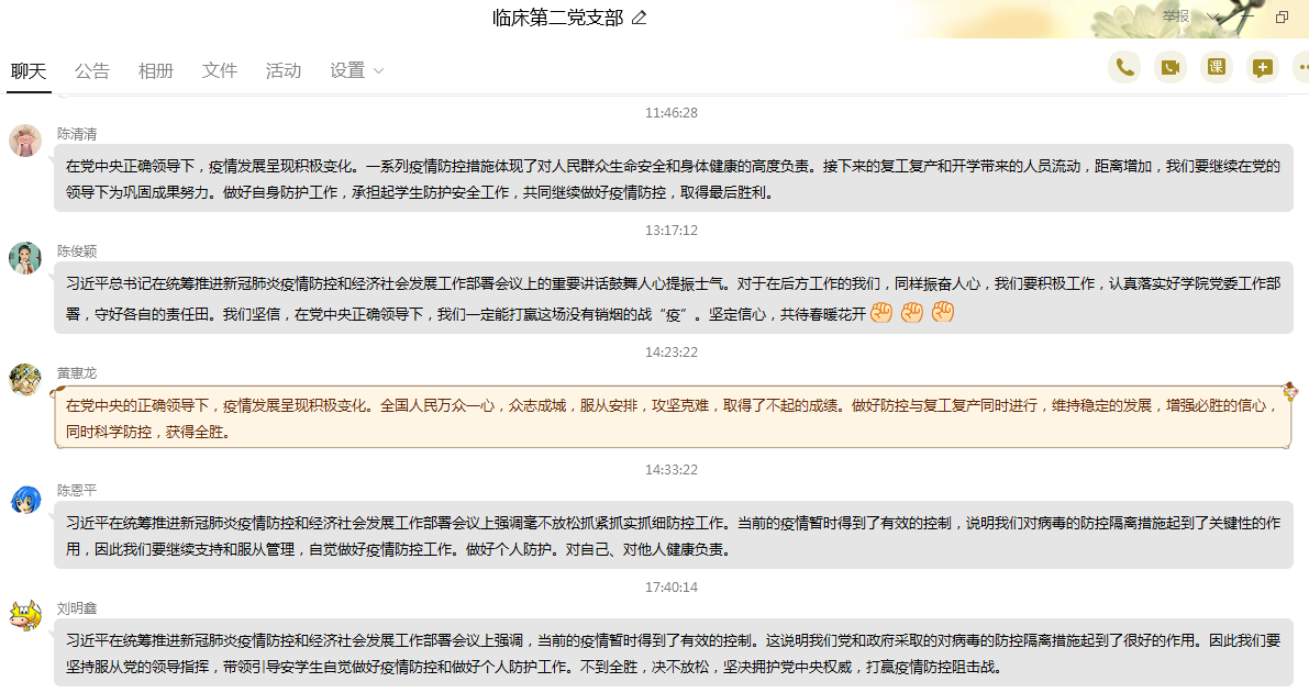 為強(qiáng)化學(xué)習(xí)效果,提高工作效率,本次學(xué)習(xí)以線上方式,提前發(fā)布學(xué)習(xí)內(nèi)容,并做好學(xué)習(xí)筆記。會上,黨員同志們圍繞習(xí)近平總書記重要講話積極參與討論,充分開展交流,黨員同志們表示期疫情防控雖已呈現(xiàn)向好趨勢,但仍不能放松警惕。我們雖未能向醫(yī)護(hù)工作者一樣奔赴前線,亦能宅家發(fā)揮個(gè)人力量,認(rèn)真貫徹落實(shí)各級會議精神的同時(shí),立足本職工作,做好黨建宣傳工作,做好學(xué)生管理工作,做好畢業(yè)生就業(yè)工作,嚴(yán)格按照“11個(gè)一律”將防控工作做到位,確保校園安全穩(wěn)定,助力疫情防控取得最終勝利。