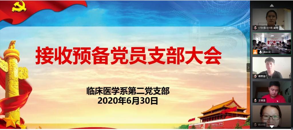 2020年6月30日下午,臨床醫(yī)學系第二黨支部采用線上結合線下的方式召開接收預備黨員大會。本次會議是嚴格按照黨章和發(fā)展黨員的規(guī)定,按組織程序,經上級黨委批準,召開關于討論接收馬慧芯等6位同志為中共預備黨員的支部大會。