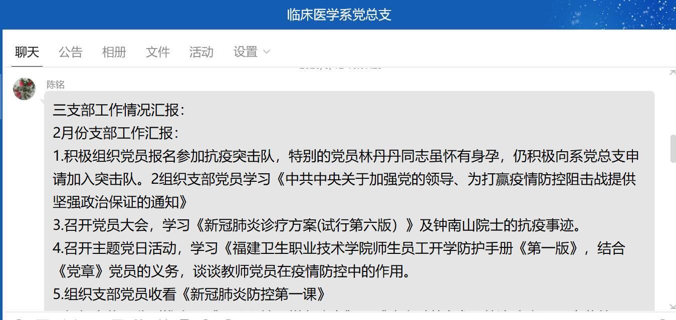 會上,各支部書記詳細(xì)匯報(bào)了2月份各項(xiàng)工作開展情況。第一黨支部在分管領(lǐng)導(dǎo)鄭翠紅副校長帶領(lǐng)下,由臨床醫(yī)學(xué)系黨總支部牽頭,一支部具體負(fù)責(zé),藥學(xué)系第二黨支部協(xié)助,于2月10日組建了由22位黨員及部分入黨積極分子、志愿者組成的閩衛(wèi)院黨員衛(wèi)生防疫突擊隊(duì),積極參與學(xué)院的各項(xiàng)防疫工作。制定開學(xué)后,防控新冠肺炎期間,門診部工作計(jì)劃安排,第一黨支部執(zhí)業(yè)醫(yī)師注冊門診部的黨員教師全體參與臨床一線工作。第二黨支部組織支部黨員同志積極參與黨員突擊隊(duì),支部各位黨員各司其職,通過QQ群、微信群,向?qū)W生及時傳達(dá)學(xué)院有關(guān)防疫工作的重要會議、文件精神與防疫知識;每天定時上報(bào)實(shí)習(xí)生和在校生去向及健康情況,及時了解學(xué)生動態(tài),跟蹤異常學(xué)生情況。開展線上主題班會進(jìn)行防疫知識,防騙教育,關(guān)注學(xué)生心理健康,了解困難學(xué)生情況,宣傳學(xué)校關(guān)于受疫情影響的補(bǔ)助政策,及時提供幫助。并收集校友、系部師生的戰(zhàn)“疫” 事跡,做好宣傳工作。第三黨支部積極組織黨員報(bào)名參加抗疫突擊隊(duì),特別的黨員林丹丹同志雖懷有身孕,仍積極向系黨總支申請加入突擊隊(duì)。并利用中醫(yī)專業(yè)優(yōu)勢組織宣傳,分別推出了《習(xí)八段錦,增免疫力》、《防疫科普 | 中醫(yī)外治防疫——中藥外用篇》和《【防疫科普 | 中醫(yī)外治防疫——“六字訣"篇》專題。