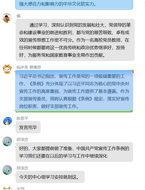 系黨總支宣傳委員陳銘、紀(jì)檢委員鄧元榮分別做了主題發(fā)言。圍繞《中國(guó)共產(chǎn)黨宣傳工作條例》的內(nèi)容,結(jié)合自身的崗位職責(zé)以及學(xué)院新一輪建設(shè)目標(biāo),深入地解讀了《條例》的精神和要求,為大家進(jìn)一步學(xué)習(xí)《條例》提供指導(dǎo)。隨后,各黨支部宣傳委員也紛紛分享了學(xué)習(xí)體會(huì)。