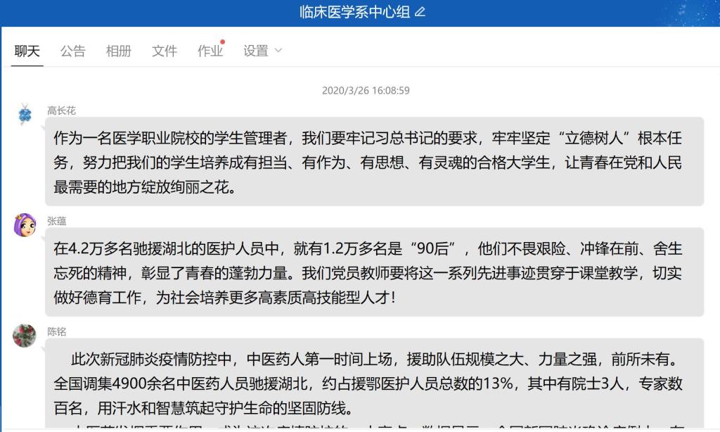 第二黨支部書記高長花發(fā)言道:作為一名醫(yī)學(xué)職業(yè)院校的學(xué)生管理者,我們要牢記習(xí)近平總書記的要求,牢牢堅(jiān)定“立德樹人”根本任務(wù),努力把我們的學(xué)生培養(yǎng)成有擔(dān)當(dāng)、有作為、有思想、有靈魂的合格大學(xué)生,讓青春在黨和人民最需要的地方綻放絢麗之花。第三黨支部書記陳銘發(fā)言道:中醫(yī)藥發(fā)揮重要作用,成為這次疫情防控的一大亮點(diǎn)。全國新冠肺炎確診病例中,中醫(yī)藥總有效率達(dá)到了90%以上。中醫(yī)藥的療效是實(shí)實(shí)在在的,作為中醫(yī)人,我們必須要傳承好中醫(yī)的優(yōu)秀成果,并做好傳幫帶工作。
