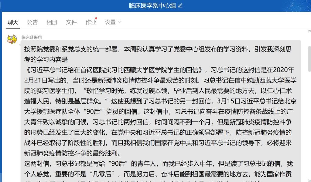 疫情還未結(jié)束,中心組成員在線召開會議,堅(jiān)持學(xué)習(xí)。會中,朱翔同志做主題發(fā)言,他從習(xí)近平總書記的回信想到了另一封回信,3月15日習(xí)近平總書記給北京大學(xué)援鄂醫(yī)療隊(duì)全體“90后”黨員的回信。這封信中,習(xí)近平總書記向奮斗在疫情防控各條戰(zhàn)線上的廣大青年致以誠摯的問候。習(xí)近平總書記的兩封回信,時間間隔不到一個月,但是新冠肺炎疫情防控斗爭的形勢已經(jīng)發(fā)生了巨大的變化,在黨中央和習(xí)近平總書記的正確領(lǐng)導(dǎo)部署下,防控新冠肺炎疫情的戰(zhàn)斗已經(jīng)取得了階段性的勝利,而且我相信我們國家在黨中央和習(xí)近平總書記的領(lǐng)導(dǎo)下,必將迎來新冠肺炎疫情防控斗爭的最終勝利。他還從個人經(jīng)歷勉勵大家,能為國家作貢獻(xiàn)、為人民服務(wù),才是實(shí)現(xiàn)人生價值的最好途徑。