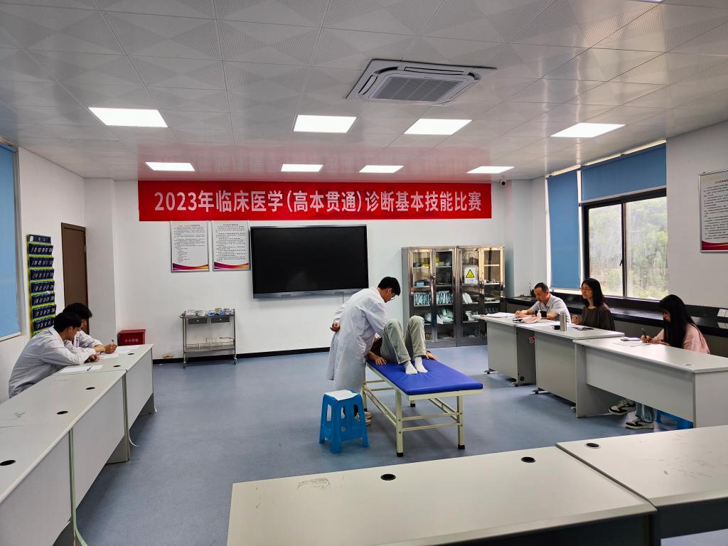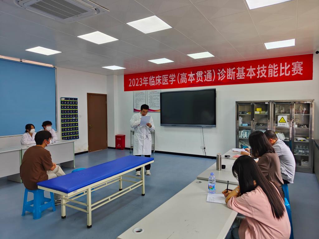 為全面貫徹落實(shí)黨的二十大精神,進(jìn)一步推動(dòng)臨床醫(yī)學(xué)實(shí)踐教學(xué)改革,創(chuàng)新實(shí)踐教學(xué)體系,加強(qiáng)醫(yī)學(xué)生臨床思維、技能操作能力、人文關(guān)懷精神的培養(yǎng),提升醫(yī)學(xué)生科技創(chuàng)新能力、實(shí)踐能力和團(tuán)隊(duì)合作意識(shí),5月20日,由醫(yī)學(xué)院教師第一黨支部、醫(yī)學(xué)院團(tuán)總支、臨床醫(yī)學(xué)專業(yè)舉辦的“臨床醫(yī)學(xué)(高本貫通)診斷基本技能比賽”正式拉開帷幕。大賽前期經(jīng)過初賽角逐,共12名學(xué)生4支隊(duì)伍進(jìn)入決賽。比賽包括個(gè)人賽和團(tuán)體賽兩個(gè)賽項(xiàng),個(gè)人賽項(xiàng)目為體格檢查,團(tuán)體賽包括病史采集、體格檢查及病例分析三個(gè)項(xiàng)目。