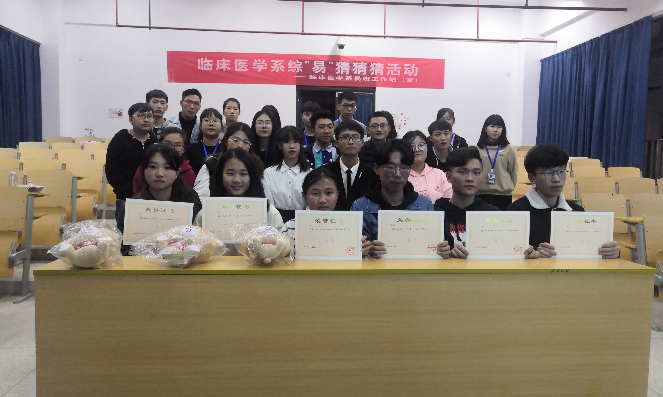 綜“易”猜猜猜活動(dòng)在臨床系舞蹈隊(duì)充滿活力的舞蹈中展開了。第一輪“看歌詞猜歌名”的淘汰賽;每組選手依次答題,不僅選手們努力答題,老師和在場觀眾也絞盡腦汁參與其中。第二輪“聽伴奏猜歌名”選手們更是踴躍舉手搶答,熱情高漲。在此輪比賽晉級(jí)的小組進(jìn)入到最后的“你畫我猜歌名”環(huán)節(jié),選手們各式各樣的畫風(fēng)以及奇特的回答方式讓全場的氛圍十分歡樂,老師和兩委會(huì)的成員們也大顯身手。比賽最后,18針推302贏得了本次比賽的第一名,活動(dòng)圓滿結(jié)束。