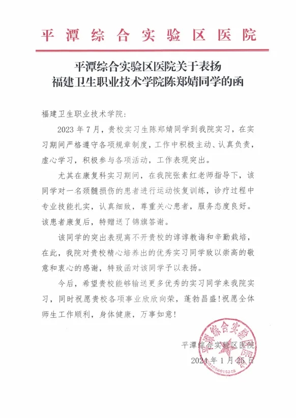 2024年1月25日,我校醫(yī)學院收到了一封來自學生實習單位平潭綜合實驗區(qū)醫(yī)院的表揚信,對在該醫(yī)院實習的陳鄭婧同學給予了高度評價。在實習期間,陳鄭婧同學服從實習醫(yī)院安排,并以最佳的精神狀態(tài)融入實習工作,在自己的崗位上兢兢業(yè)業(yè),將理論與實際緊密結(jié)合,高標準完成任務(wù)。