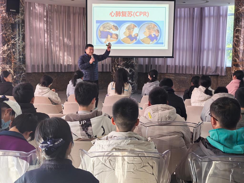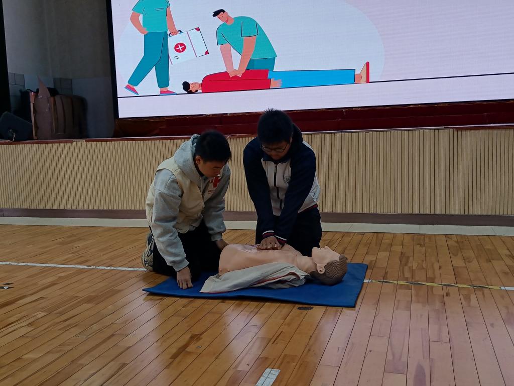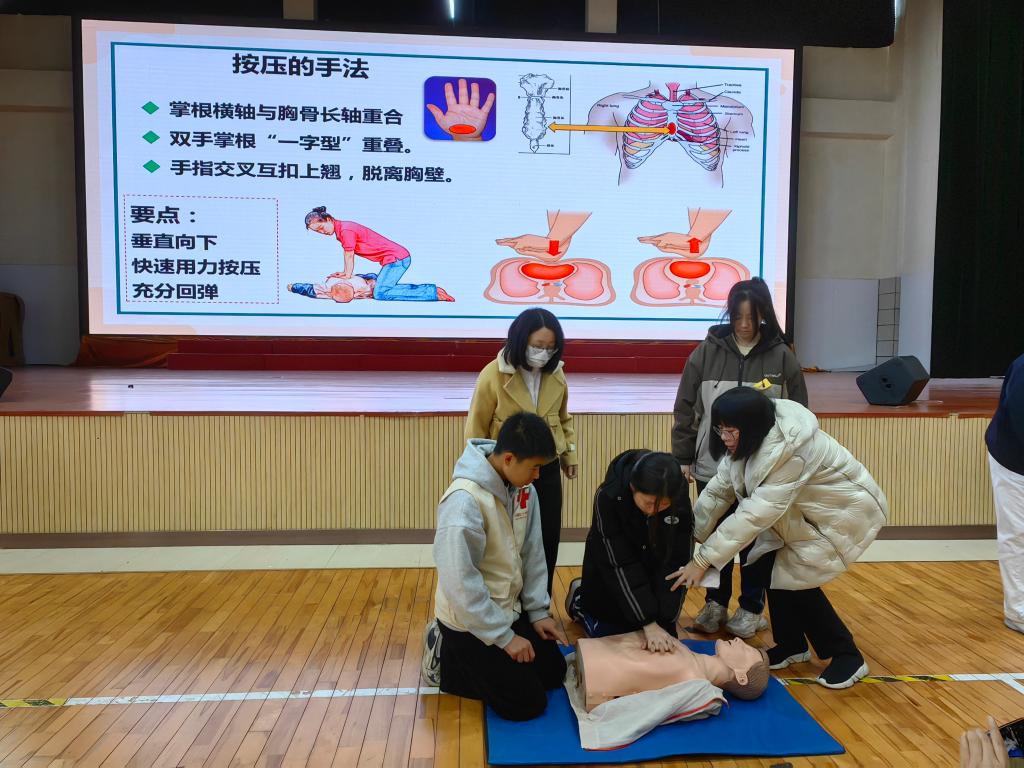 我校一直高度重視急救教育工作,加強學(xué)校急救教育,培養(yǎng)師生樂于施救、敢于施救、善于施救的意識和能力,積極開展急救教育活動。培訓(xùn)課程中,我校葉榕、修麗莉、張靜雯三位老師以扎實的理論知識為基石,為學(xué)生們詳細(xì)剖析了心肺復(fù)蘇、氣道異物梗阻、自動體外除顫儀(AED)等關(guān)鍵救助方法。從心臟驟停的緊急判斷,強調(diào)“黃金4分鐘”是挽救心臟驟停的關(guān)鍵,到心肺復(fù)蘇的精準(zhǔn)按壓與人工呼吸比例,科普應(yīng)急救護知識。生動的案例與深入淺出的講解相融合,讓抽象的急救知識瞬間鮮活起來,學(xué)生們?nèi)褙炞ⅲJ(rèn)真學(xué)習(xí)。通過生動的講述和直觀的實操展示相結(jié)合,教授學(xué)生掌握心肺復(fù)蘇的操作過程及注意事項,同時與現(xiàn)場同學(xué)進行了豐富有趣的實操互動,讓同學(xué)在學(xué)習(xí)心肺復(fù)蘇急救方法的同時,通過模擬場景,上手實操加深對心肺復(fù)蘇急救的印象。