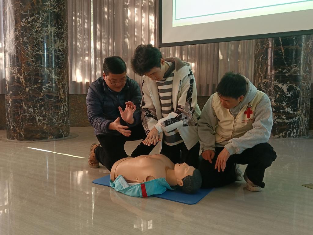 實踐操作,技能在握。在實踐操作環(huán)節(jié),模擬人成為師生們的“急救搭檔”。講師和我校紅十字會的志愿者們現(xiàn)場演示心肺復(fù)蘇的標(biāo)準(zhǔn)動作,每一次按壓的深度、頻率,每一次人工呼吸的時機與技巧,都展示得淋漓盡致,讓學(xué)生們能夠更直觀地認(rèn)識學(xué)習(xí)心肺復(fù)蘇的流程。學(xué)生們紛紛踴躍參與,親身體驗急救操作的全過程。講師則在一旁耐心指導(dǎo),糾正動作偏差,提示關(guān)鍵要點,確保每位參與者都能精準(zhǔn)掌握操作要領(lǐng)?;咏虒W(xué)的熱烈氛圍中,同學(xué)們逐漸從生疏走向熟練。