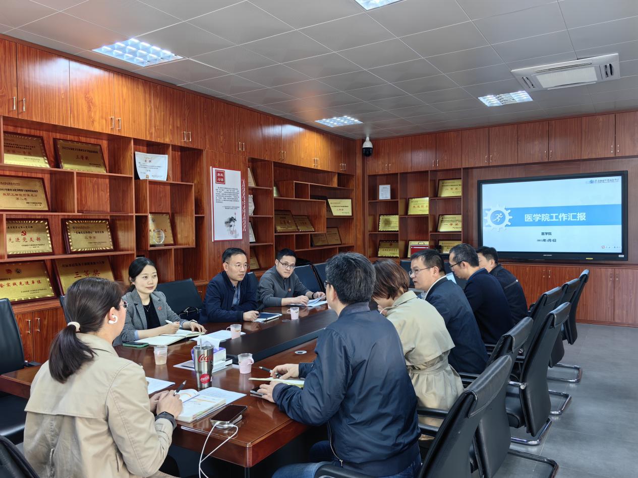 醫(yī)學(xué)院領(lǐng)導(dǎo)班子對學(xué)院基本情況、工作亮點、存在問題及下一步工作思路作工作匯報,重點分析了當前面臨的挑戰(zhàn)和困難并提出了改進建議。徐偉聽取了匯報后對醫(yī)學(xué)院的發(fā)展表示高度重視,要求醫(yī)學(xué)院在今后的工作中,緊密結(jié)合學(xué)校的整體發(fā)展戰(zhàn)略,進一步提升教學(xué)科研水平,為培養(yǎng)高素質(zhì)醫(yī)學(xué)人才貢獻力量,并提出了三個方面的工作要求:第一,重視高質(zhì)建設(shè)專業(yè),提升專業(yè)水平和質(zhì)量;第二,注重凝煉教學(xué)成果,以教學(xué)改革和創(chuàng)新突出亮點;第三,夯實教師科研水平,強化基礎(chǔ)研究與應(yīng)用研究的結(jié)合,推動科研成果轉(zhuǎn)化。