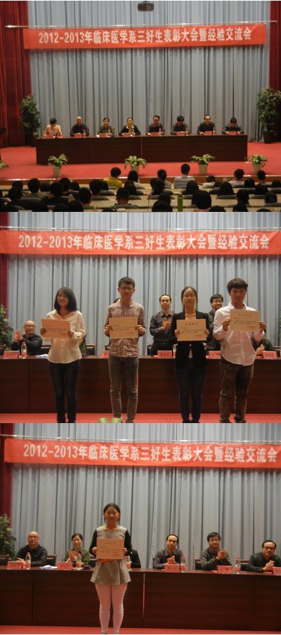 為激勵2012-2013學(xué)年先進(jìn)集體及先進(jìn)個人,“2012-2013學(xué)年臨床醫(yī)學(xué)系三好生表彰大會暨經(jīng)驗交流會”于 11月 6 日下午在學(xué)術(shù)廳隆重舉行。院學(xué)生工作處處長黃銘珊,院團(tuán)委副書記宋維,臨床醫(yī)學(xué)系黨總支書記邱滾忠,系主任潘在興、鄭向紅,副主任林國威,主任助理林浩,系團(tuán)總支書記邱萍,全體輔導(dǎo)員,以及2012級、2013級學(xué)生代表參加了本次大會。大會由系團(tuán)總支書記邱萍老師主持。