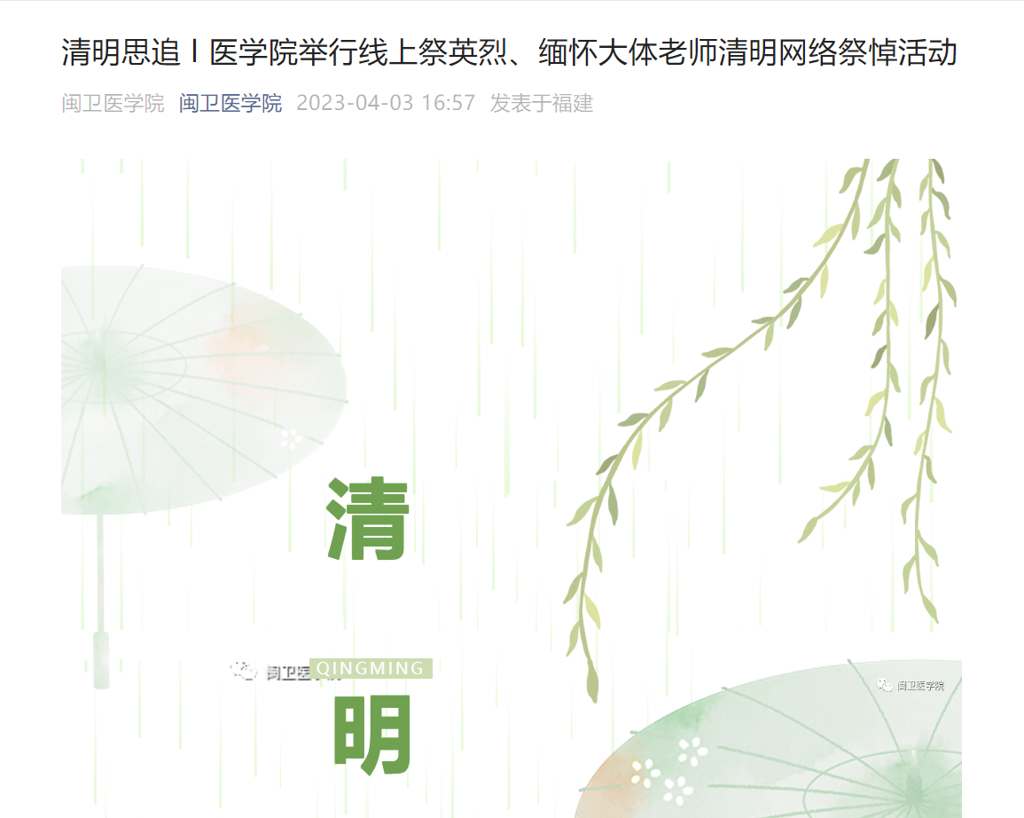 本次清明專題紀(jì)念活動(dòng)前期,醫(yī)學(xué)院教師第二黨支部、醫(yī)學(xué)院團(tuán)總支開展線上祭英烈、緬懷大體老師清明網(wǎng)絡(luò)祭悼活動(dòng),并制作了追思推文,發(fā)布于醫(yī)學(xué)院公眾號(hào),號(hào)召同學(xué)們一同學(xué)習(xí)緬懷。線上線下同步推廣,擴(kuò)大了活動(dòng)的參與面,讓更多的同學(xué)一同撫今追昔思奮進(jìn)。