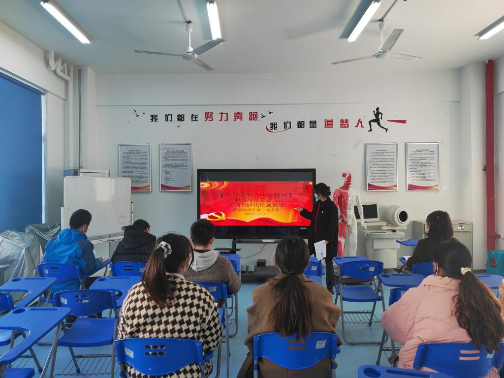 為深入貫徹落實黨的二十大精神,進一步全面學(xué)習(xí)領(lǐng)會習(xí)近平新時代中國特色社會主義思想,推動黨的二十大精神進校園、進支部,提升支部黨員政治理論素養(yǎng),醫(yī)學(xué)院學(xué)生第二黨支部于2022年12月19日召開黨員大會,組織支部全體黨員與學(xué)生黨員發(fā)展對象開展《不斷譜寫馬克思主義中國化時代化新篇章》主題黨課學(xué)習(xí)。此次黨課由支部書記陳清清主講。