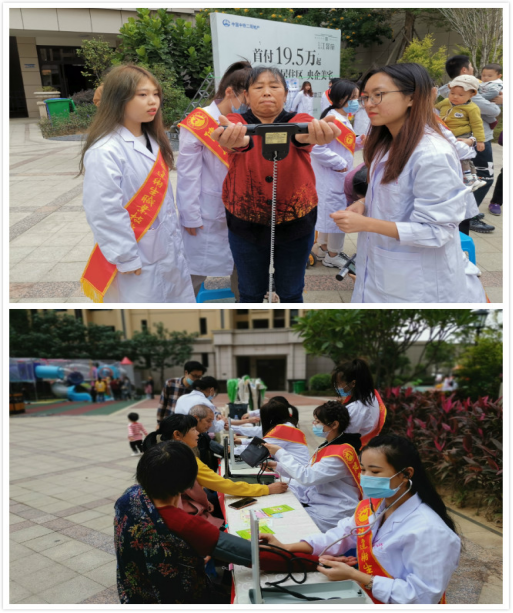 本次活動,主要分為義診、營養(yǎng)調(diào)查及有獎互動環(huán)節(jié)?;顒娱_始前,老師與志愿者們通過橫幅宣傳、懸掛各類營養(yǎng)知識海報的形式向社區(qū)居民展示膳食寶塔、膳食指南等日常膳食營養(yǎng)知識。
