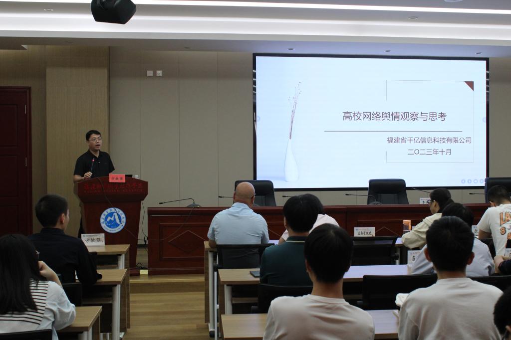 會議還邀請福建省千億信息科技有限公司總經(jīng)理、高級工程師方敏強(qiáng)做《高校網(wǎng)絡(luò)輿情觀察與思考》的講座,對全國、全省高校網(wǎng)絡(luò)輿情情況進(jìn)行介紹,對我校網(wǎng)絡(luò)輿情情況進(jìn)行分析。通過本次專題講座,參會人員受益匪淺,表示要進(jìn)一步加強(qiáng)學(xué)校網(wǎng)絡(luò)信息安全工作,主動學(xué)習(xí)、掌握規(guī)律,做好信息溝通、輿情監(jiān)控、風(fēng)險研判,不斷健全學(xué)校網(wǎng)絡(luò)輿情綜合性防控體系,促進(jìn)學(xué)校意識形態(tài)工作整體進(jìn)一步提升。