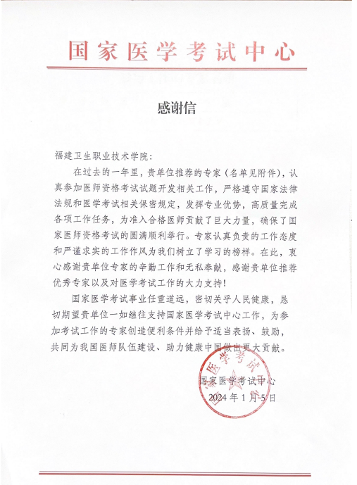 近日,我校收到國家醫(yī)學考試中心發(fā)來的感謝信,信中對我校公共衛(wèi)生與健康管理學院李宏老師作為專家組成員參加國家醫(yī)學考試中心醫(yī)師資格考試試題開發(fā)相關工作表示感謝和肯定。