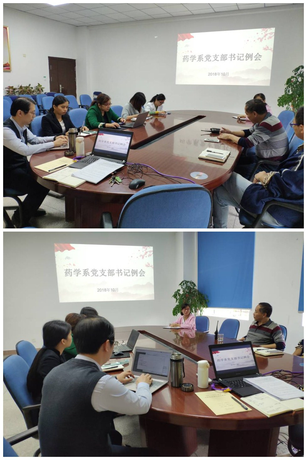 10月17日,藥學系黨總支在系部會議室召開支部書記例會,會議由總支書記鄭力宏主持,藥學系領導班子成員、總支委員、支部書記出席會議。
