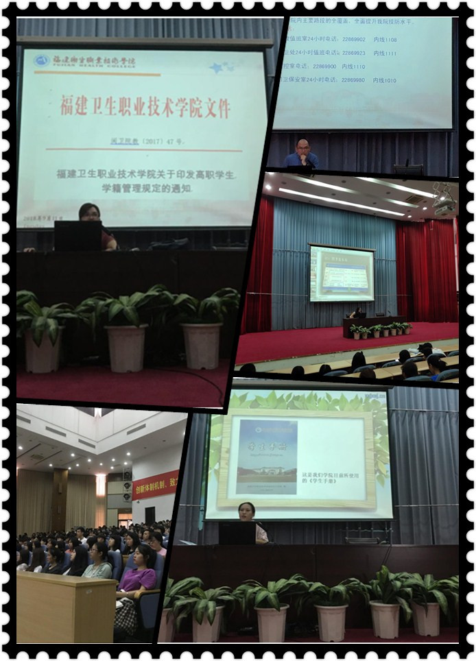 我系潘雪豐副首先為同學(xué)們播放學(xué)院宣傳片,讓大家對(duì)學(xué)院的歷史、學(xué)院的概況有了直觀的認(rèn)識(shí),隨后結(jié)合系部的實(shí)際為新生了介紹了專業(yè)學(xué)習(xí)和專業(yè)前景。陳潔副書記則為新生進(jìn)行了紀(jì)律教育,從為什么要遵守紀(jì)律、遵紀(jì)守法對(duì)我們的影響等幾個(gè)方面強(qiáng)調(diào)學(xué)生必須遵守的各項(xiàng)規(guī)章制度,同時(shí)要求“千禧一代”的學(xué)生要認(rèn)真學(xué)習(xí)習(xí)近平新時(shí)代中國特色社會(huì)主義思想,引導(dǎo)學(xué)生樹立崇高理想,誓為健康護(hù)航。圖書館張麗萍老師、保衛(wèi)處葛能杰老師還分別為同學(xué)們介紹了圖書館的借書流程、書本檢索知識(shí)、防火、防盜、防欺凌、防詐騙、防校園貸等校園安全知識(shí)等,幫助學(xué)生樹立正確的校園安全觀。